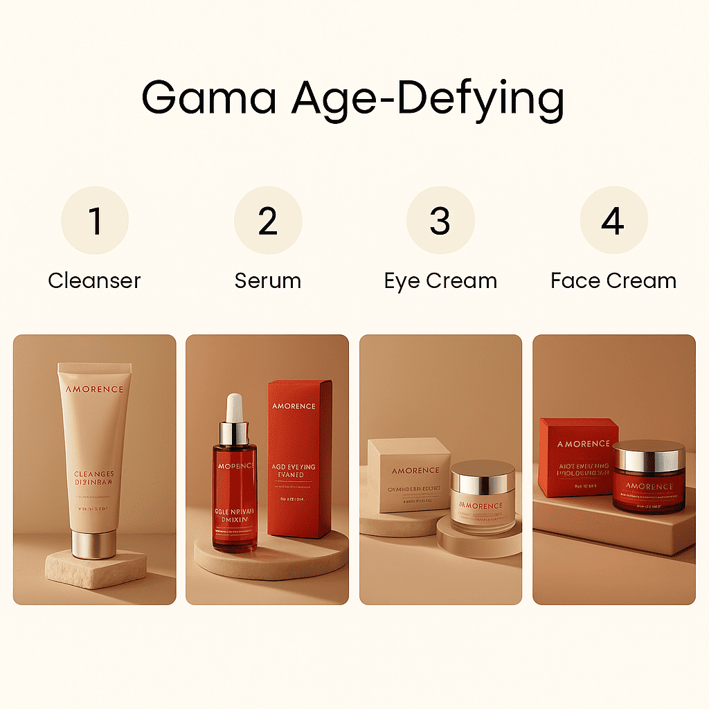 La gama Age-Defying en 4 pasos es una rutina antiedad breve y eficaz: retinoides bien dosificados + niacinamida + vitamina C etilada + péptidos + ácido hialurónico + ceramidas/carnosina. Renovación, firmeza, tono uniforme y barrera fuerte con texturas ligeras.